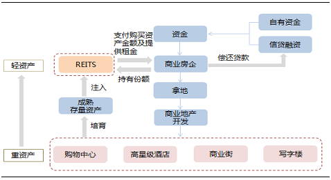 REITS对于商业地产企业运营模式最大的影响在于其提供了一种推出机制。商业地产企业首先进行以自有资金和信贷融资获得的资金进行商业地产的开发以及前期培育,等商业地产培育成熟获得稳定的租金收入后将成熟的存量资产打包设立REITS在公开市场出售部分份额回笼资金,本质上是一种类住宅开发模式,提高了IRR,缩短了投资回报周期,同时房企持有部分REITS份额享受每年的分红收益以及潜在的物业升值收益,整个过程实现了由重资产向轻资产的转变。
