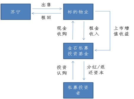 中信此次瞄准苏宁云商的O2O门店,可以看作是中信证券REITs模式向商业化迈出的重要一步。在5月上市时“中信启航”只是一个私募版本,到此次跟苏宁云商合作,依然是以金石私募投资为平台的私募版本。这就意味着,对于投资人会做出一定要求,并非面向大众的公募型产品。合作的金石私募投资基金作为中间方,面对私募投资者同时也对接标的物业,完成整个地产投资基金产品闭环。