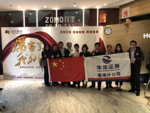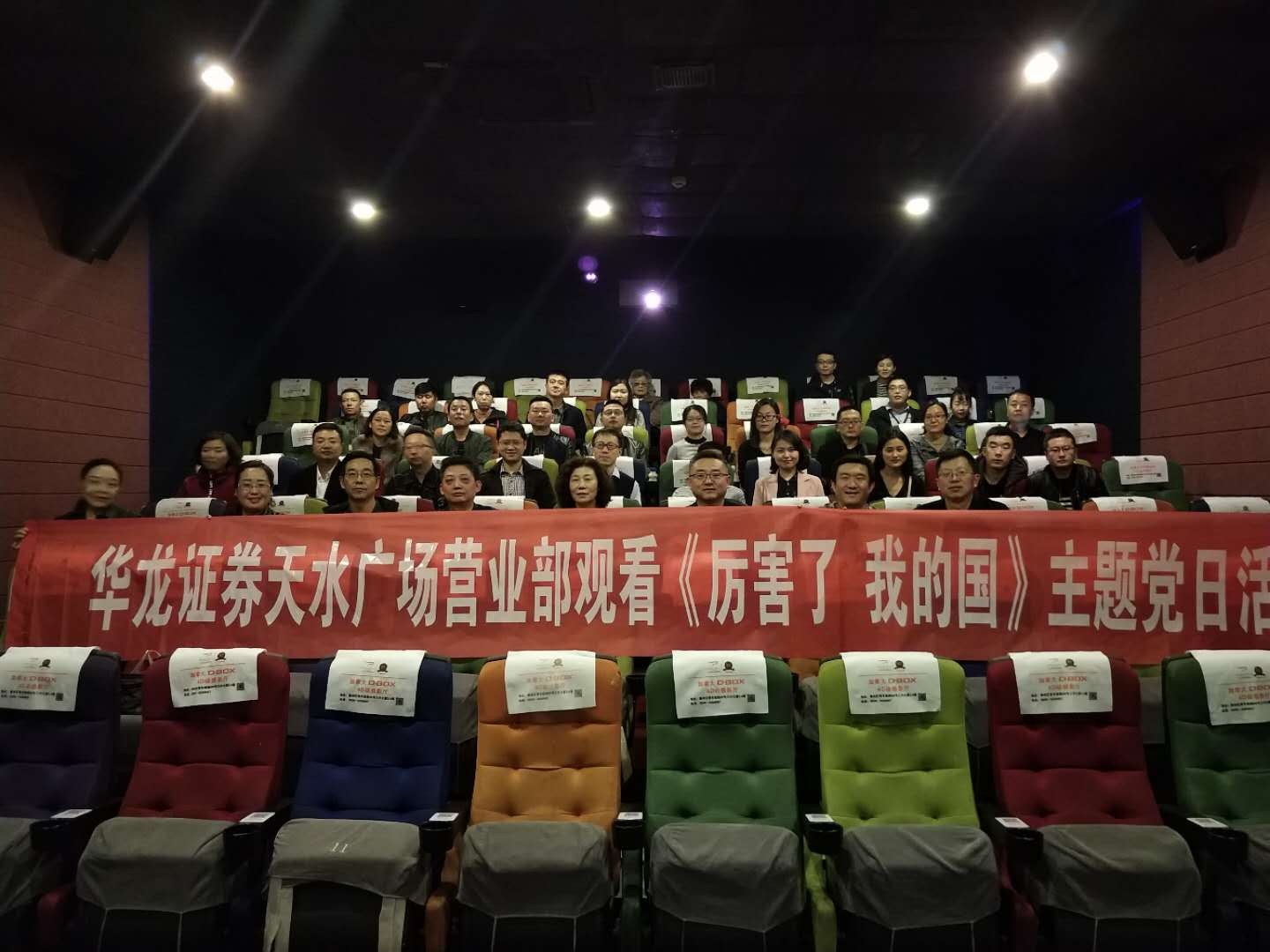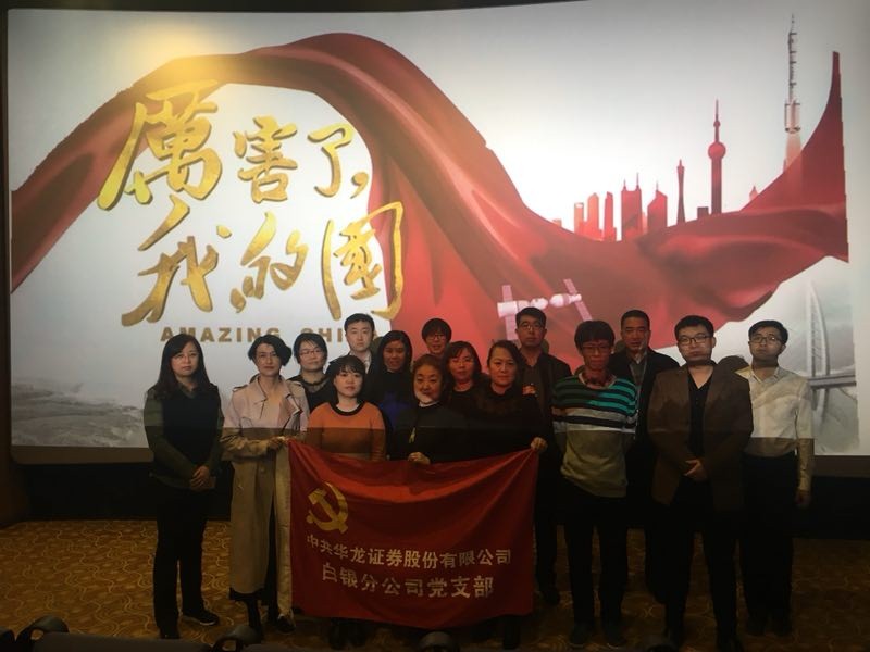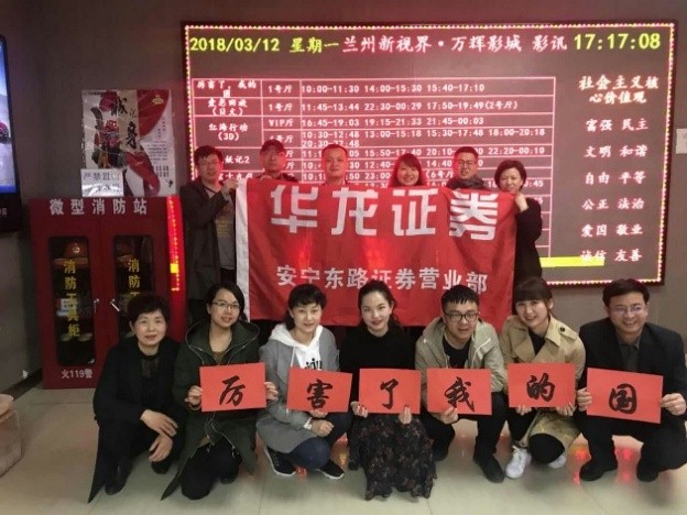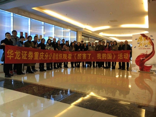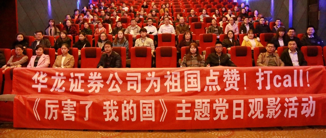 华龙证券股份有限公司党委根据公司“两学一做”学习教育制度和学习十九大精神系列活动计划,认真安排部署,积极组织全体党员、干部、员工开展《厉害了,我的国》主题党日观影活动,为每人购买2张影票,与家人朋友一同观影。不仅丰富公司学习活动内容,提高精神素养,感受新时代祖国翻天覆地变化,同时传递正能量,增强企业凝聚力,激发昂扬斗志,鼓舞全体人员朝气蓬勃迈向未来。