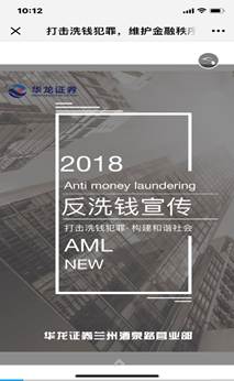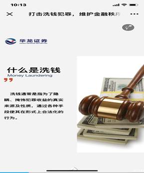 与此同时,公司各分支机构围绕“警惕洗钱陷阱和防范洗钱风险,维护金融秩序”主题,组织员工开展了以展现了证券行业反洗钱工作者履职心得感悟、记录反洗钱工作精彩瞬间的“反洗钱工作图片展” 活动,从一个侧面展现华龙证券切实履行反洗钱义务,交流反洗钱工作经验,为维护国家金融安全做出不懈努力。