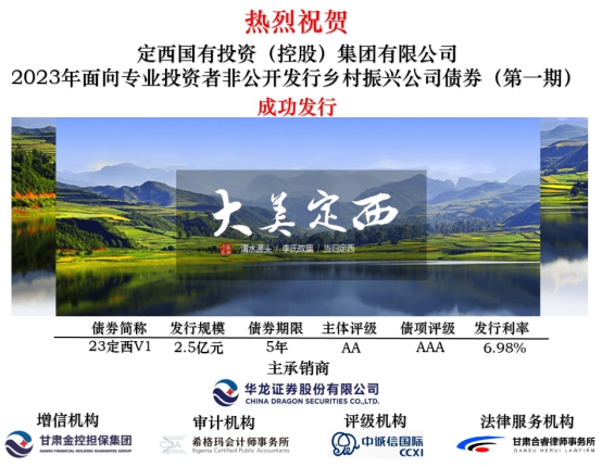 近期,华龙证券作为主承销商,推动定西国有投资(控股)集团有限公司在上海证券交易所成功发行2023年非公开发行乡村振兴公司债券(第一期)(简称“23定西V1”),发行规模2.5亿元,本期发行由甘肃金控融资担保集团提供担保增信。